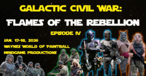 Galactic Civil War: Flames of the Rebellion (Episode IV) is a two-day event at Wayne’s World of Paintball in Ocala, FL. This well-established scenario paintball and airsoft field is home to many MindGame Production events. There are deep woods, trails, a city, and multiple villages and structures scattered across 80 acres in Central Florida. The game is tied in with the GCW economy and database so GCW veterans have the opportunity to bring their developed GCW characters and previously earned GCW credits to Altoona IV, to continue their adventures and advancement in the GCW universe. This game continues MindGame Production’s FotR event series in the Galactic Civil War universe with adventures and battles on the Outer Rim world of Altoona IV.